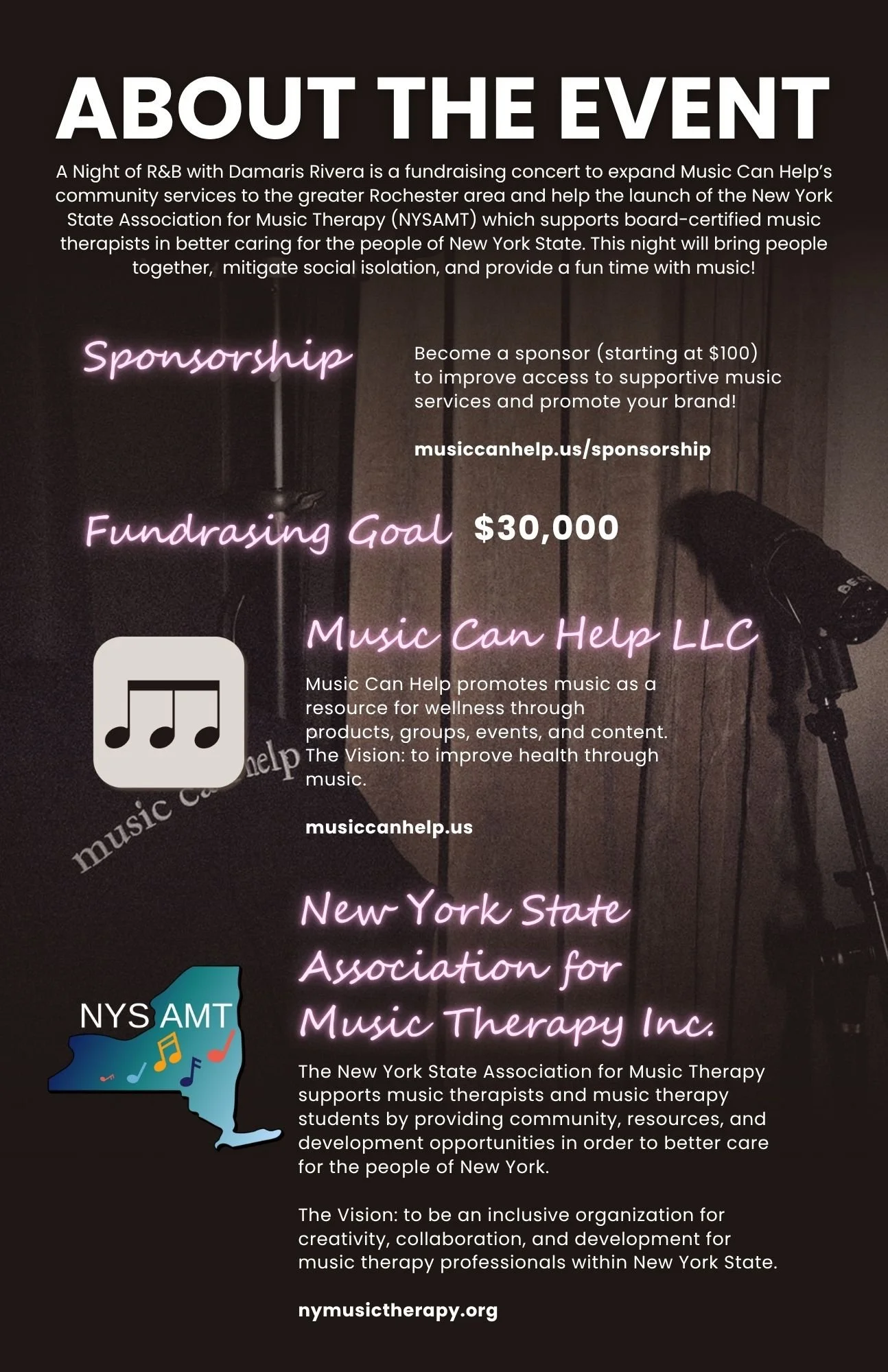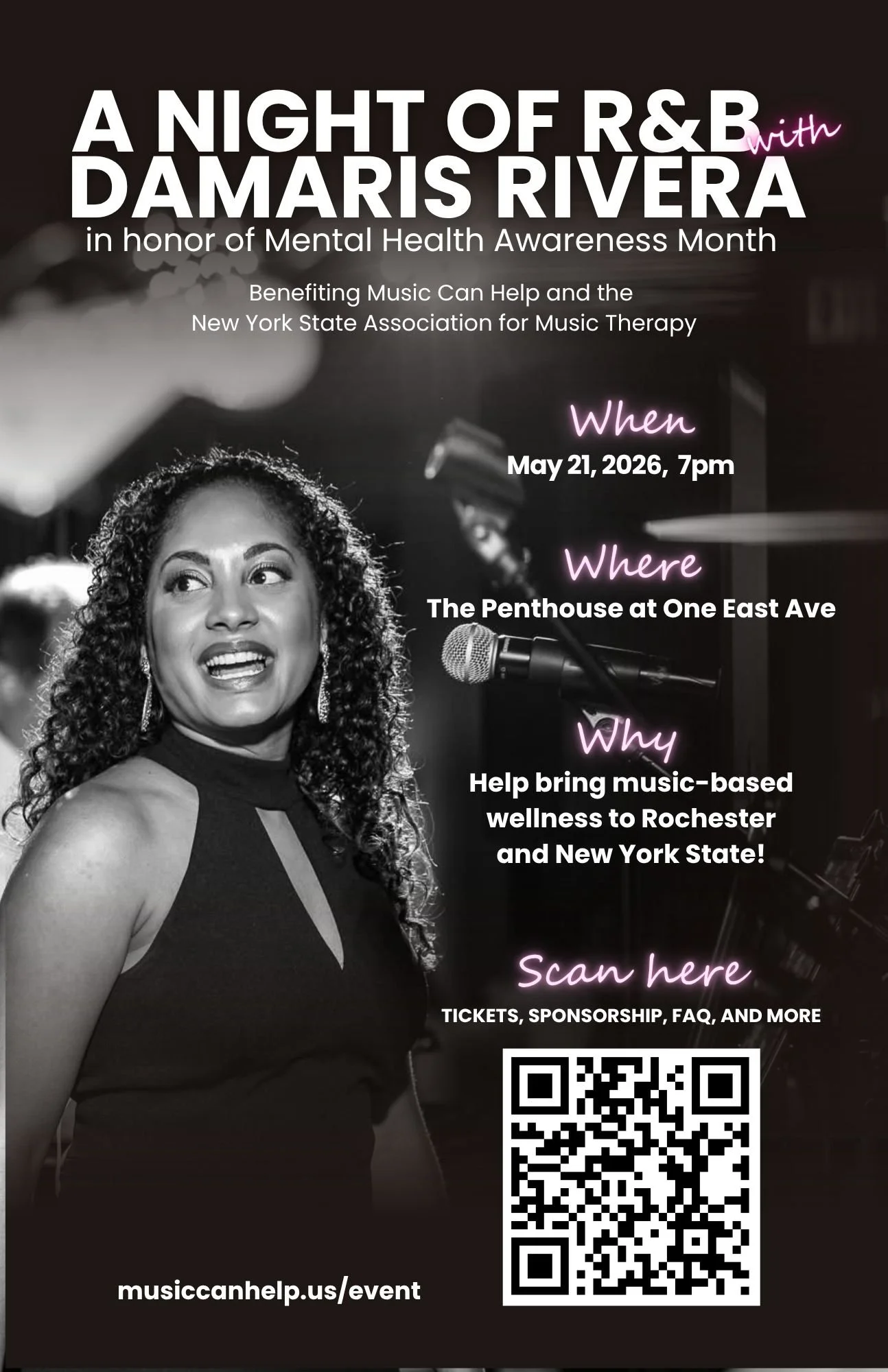 A Night of R&B with Damaris Rivera is a fundraising concert to expand Music Can Help’s community services to the greater Rochester area and help the launch of the New York State Association for Music Therapy (NYSAMT) which supports board-certified music therapists in better caring for the people of New York State. This night will bring people together, mitigate social isolation, and provide a fun time with music!